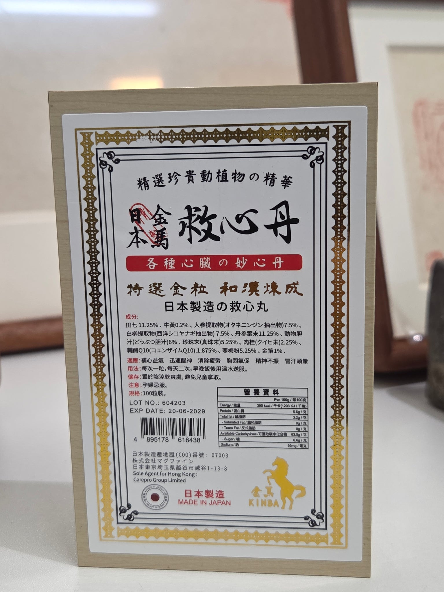 田七22.5%、牛養0.4%、人参提取物(オタネニンジン抽出物)15%、白柳提取物(西洋シコヤナギ抽出物)15%、丹参葉本22.5%、動物胆汁(どうぶつ胆汁)12%、珍珠末(真珠末)10.5%、肉桂(クイヒ未)4.5%、輔 Q10(コエンザイムQ10)3.75%、寒梅粉10.5%、金箔2%.